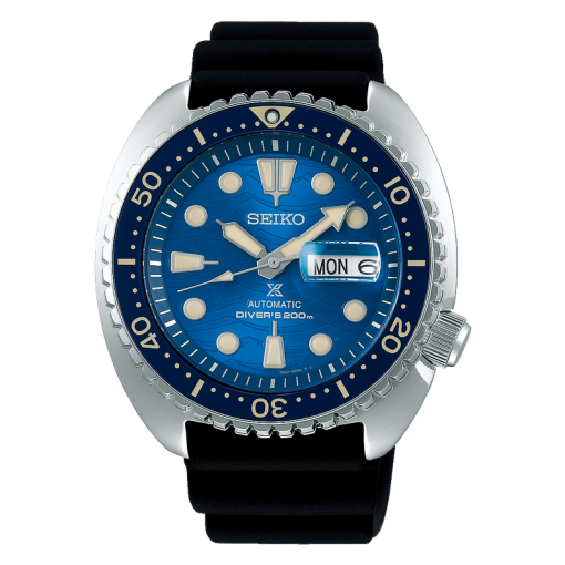 Seiko della collezione prospex di tipo subacqueo con 20 ATM. Cassa in acciaio, quadrante blu con 45mm di spessore e cinturino in gomma.