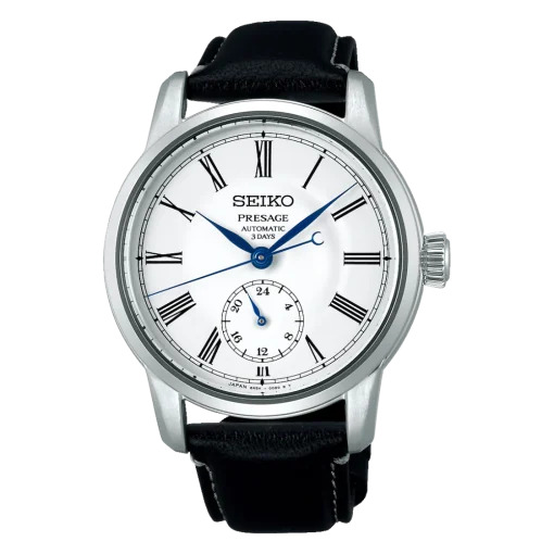 Questo orologio dal design raffinato, con il suo Quadrante in Smalto, rende omaggio a una delle prime creazioni più iconiche di Seiko: il leggendario orologio da tasca Timekeeper del 1895. Il quadrante, di un bianco smaltato lucido, crea un contrasto straordinario con i numeri romani neri e le eleganti lancette azzurrate, donando un tocco di classe senza tempo e una leggibilità impeccabile. Il cuore di questo orologio è il movimento meccanico automatico Caliber 6R5H, che garantisce precisione e affidabilità. La visualizzazione delle 24 ore, situata alle 6, aggiunge un ulteriore livello di funzionalità, mentre il tracciato dei minuti che circonda il quadrante migliora la chiarezza della lettura, infondendo nel design un fascino vintage che non passa inosservato. Un vero pezzo da collezione, che unisce eleganza, tradizione e innovazione.